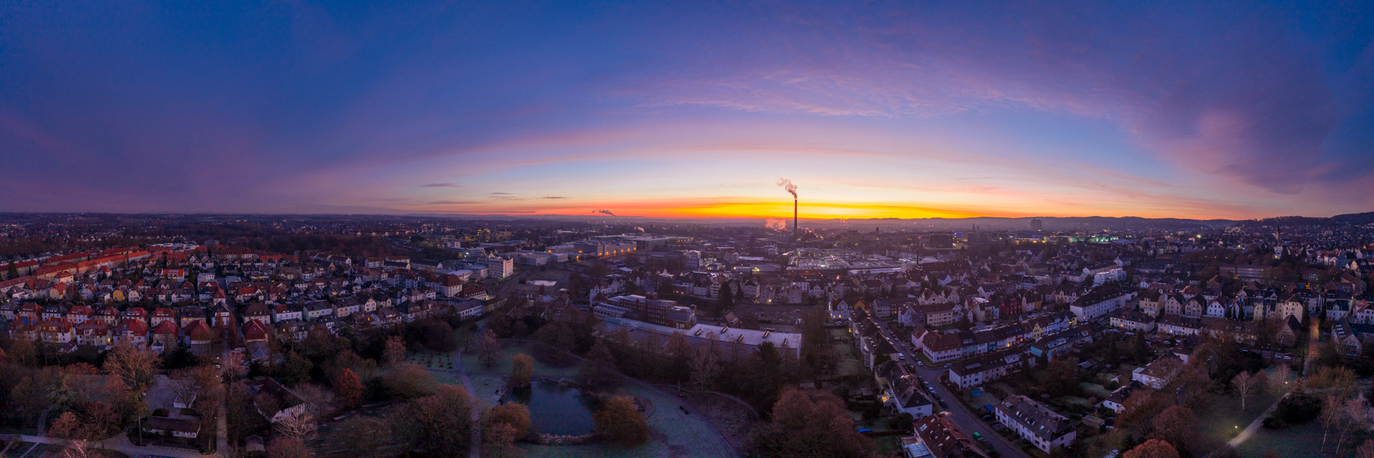 My last photos from the year 2019: On December 29th I let my drone ascend over the 'Nordpark' in Bielefeld early in the morning. It was cold and the distance view was really good. In the middle of the picture you can see the big chimney of the public utility company. The city center of Bielefeld is on the right side.