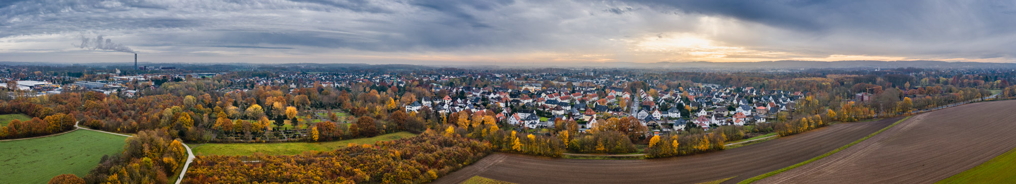Unfortunately the weather conditions are not as good as it would be necessary to take good aerial photos with a small drone. Of course, you can't expect it to be mid-November, at least not in Germany. Yesterday the sun came out in the afternoon. I took the opportunity to take some photos of the Bielefeld district 'Stieghorst'. Fortunately, there are also some fields from which one can start drones and were it is allowed. I used the DJI Mavic 2 Pro with its 20 megapixel camera again for these pictures. The focal length is about 28 mm related to the 35mm format. The panorama was stitched from two single shots using Photoshop Lightroom.
