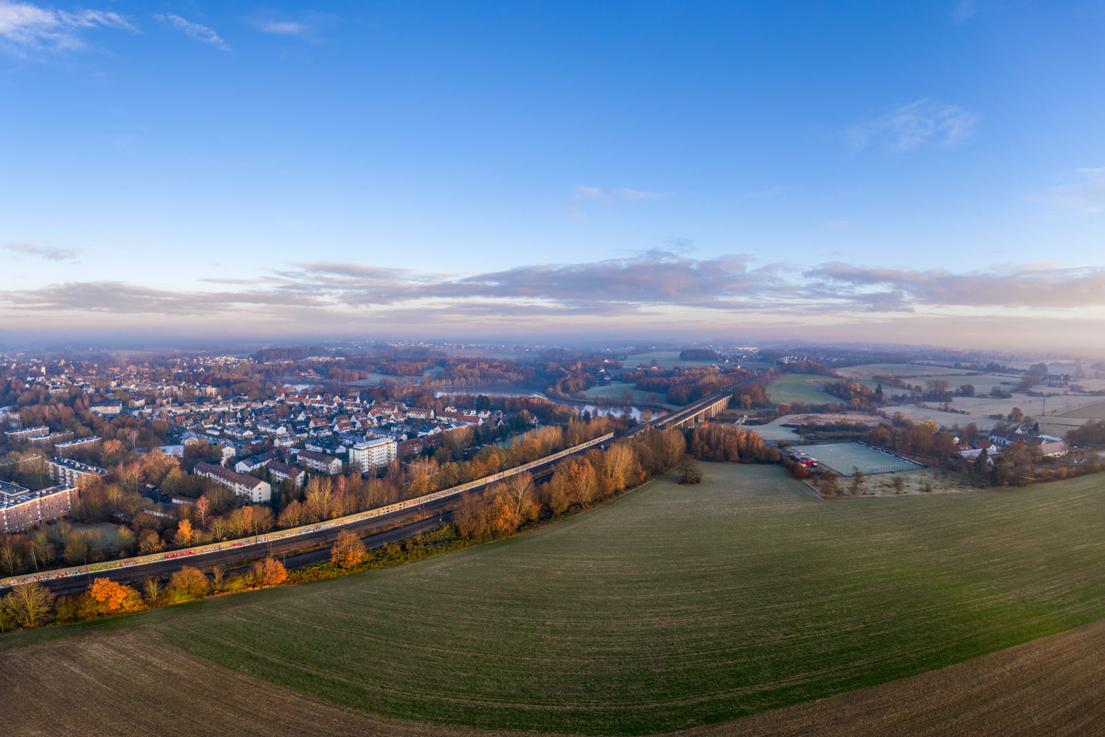 The main railway connection between Cologne and Berlin runs through Bielefeld. In the 'Schildesche' district, the railway crosses a small valley in which a reservoir, the 'Obersee', was created a few decades ago. I took the following two photos early in the morning about half an hour after sunrise from a hill above the valley. I used my drone, the DJI Mavic 2 Pro.
