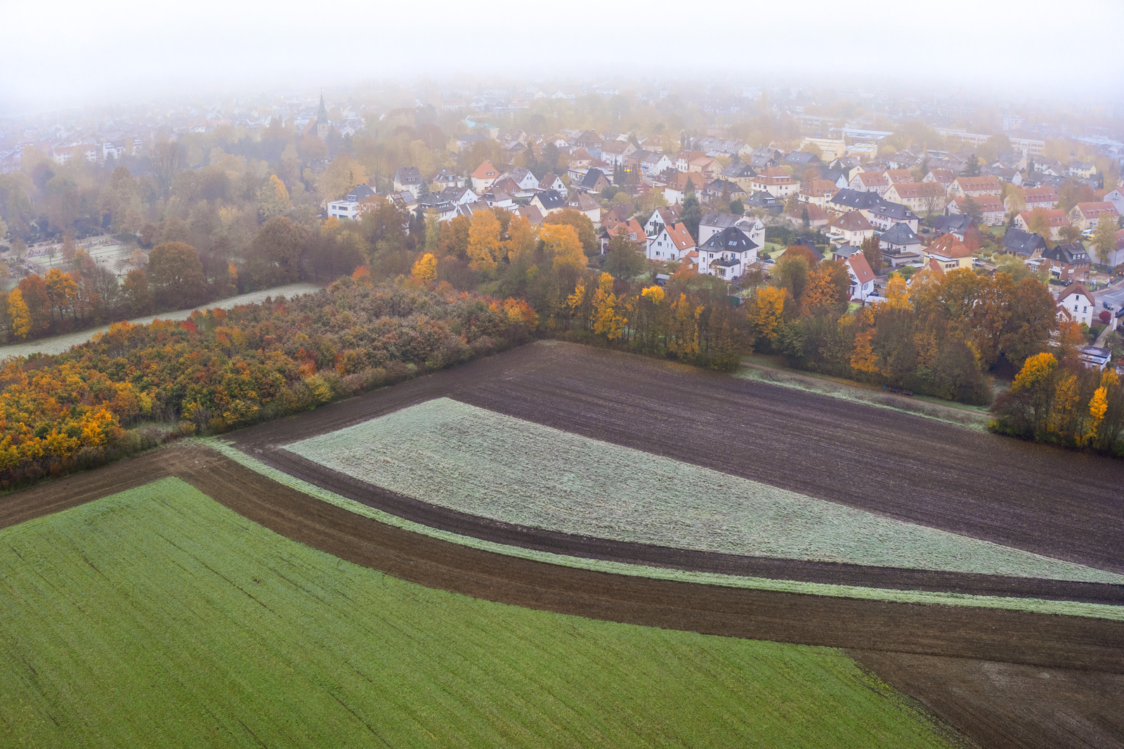 Since a few days it has become much colder. Especially in the morning you notice that. But the cool autumn weather also often provides nice light and that's why I made my way to the Bielefeld district 'Heepen' last Sunday at 7:30 am. It was quite foggy and with some sunshine over the haze the conditions for landscape photos from the air would have been very good. Unfortunately the fog remained but the sun did not come through. Nevertheless such a weather situation makes interesting photos possible.