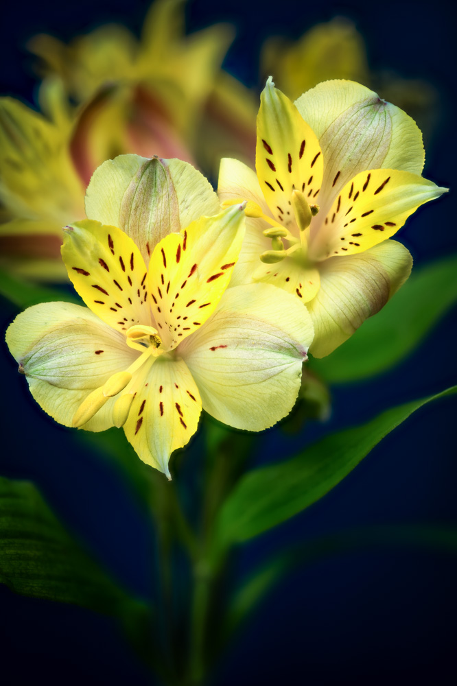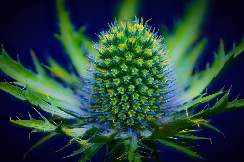 For the two photographs I plundered a bouquet of flowers and took out a eryngo and yellow peruvian lilies, both are tabletop pictures which I illuminated with two continuous lights in front of a dark blue background. Macro shots offer the possibility to show small details, which you would otherwise hardly notice, in a big way. This can be seen particularly clearly in the fine structures of the eryngo.