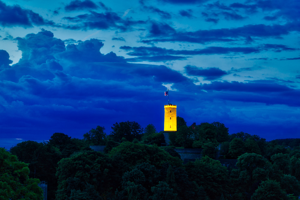 Todays sunrise over my hometown at around a quarter to six in the morning. Downtown Bielefeld with the old Nikolai church.